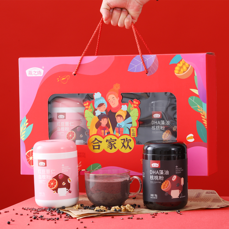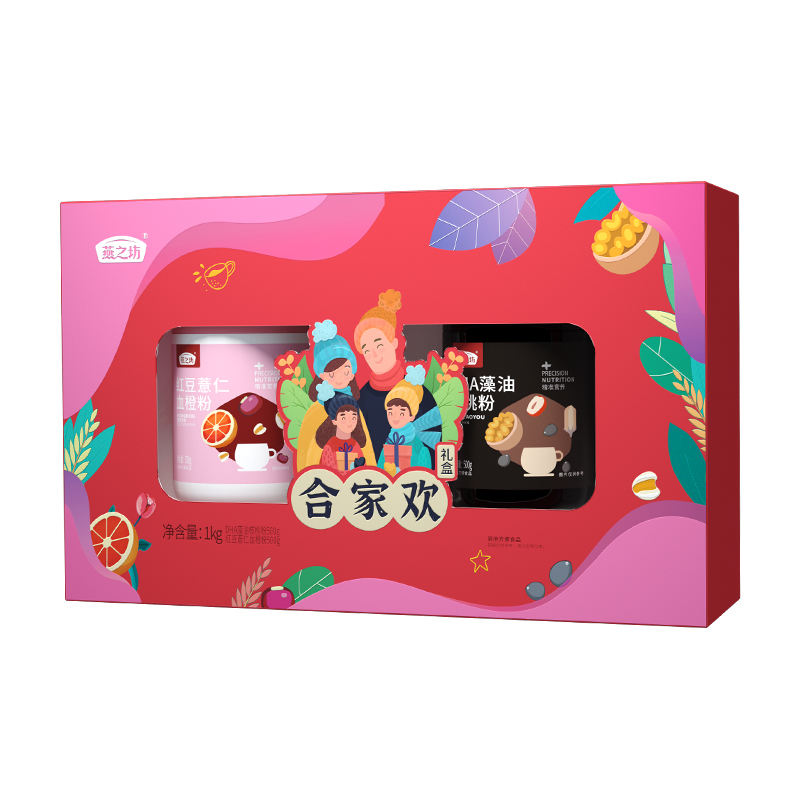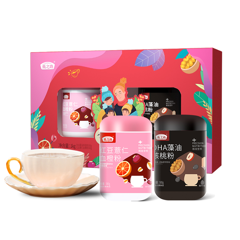 产品特点: 健脑益智和健脾祛湿双管齐下, 全家人共享健康生活! 产品明细:红豆薏仁血橙粉500g DHA藻油核桃粉500g