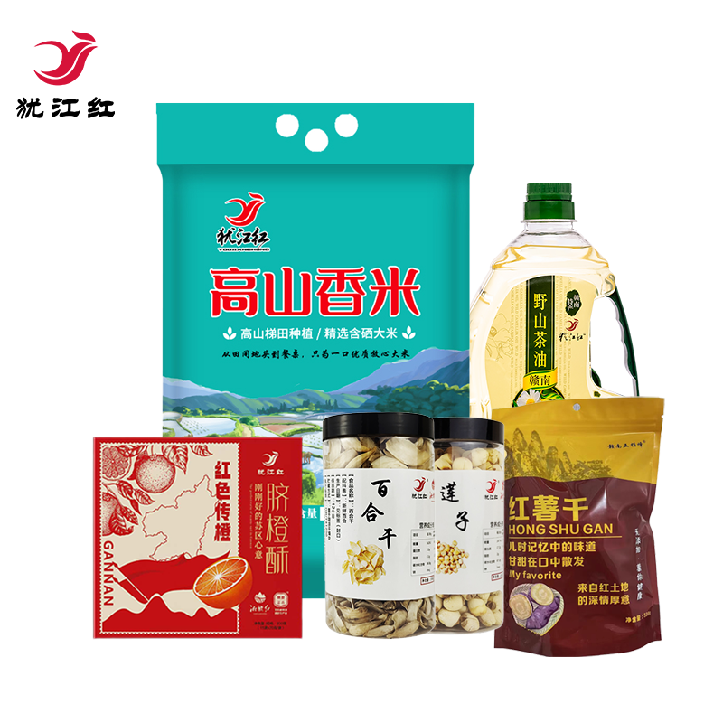 首页 / 帮扶特产 / 地方特产 / 犹江红400元套餐(山茶油1.5L含硒高山香米5kg通芯白莲子350g百合250g红薯干600g)